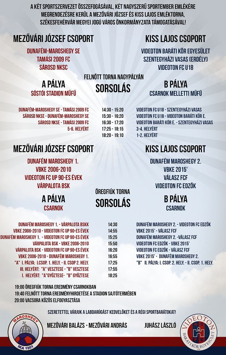 A tornát két szervezet, a Dunafém Maroshegy és a Videoton Baráti Kör rendezi. Előbbi képviseletében Mezővári Balázs mondott köszönetet a közreműködőknek a szervezésben nyújtott segítségért, és elmondta, mindenkit, aki jóban volt, vagy ismerte a két kiváló sportembert sok szeretettel várnak az egész napos eseményre.