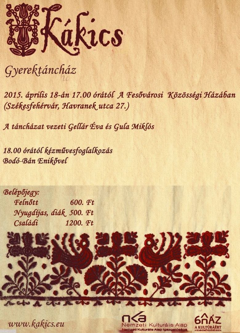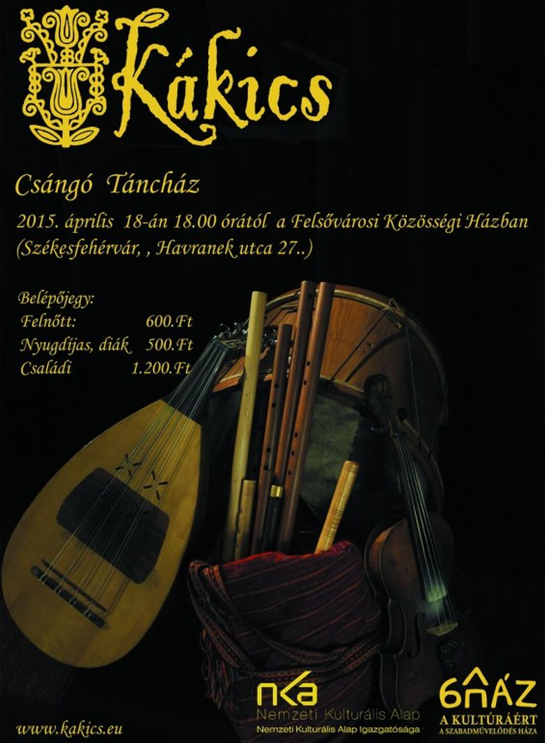 2015. április 18-án táncházba várja a Kákics együttes a vendégeket, a Felsővárosi Közösségi Házban (Havranek utca 27.). Az esemény keretében lesz gyerekjátszó 17 órától, majd ezt követően a felnőttek rophatják a táncot 18 órától. Lesz vendég is a felnőtt táncházban Nagy Ágoston személyében, aki Székelyvéckén tett utazásáról és népdalgyűjtéseiről mesél.