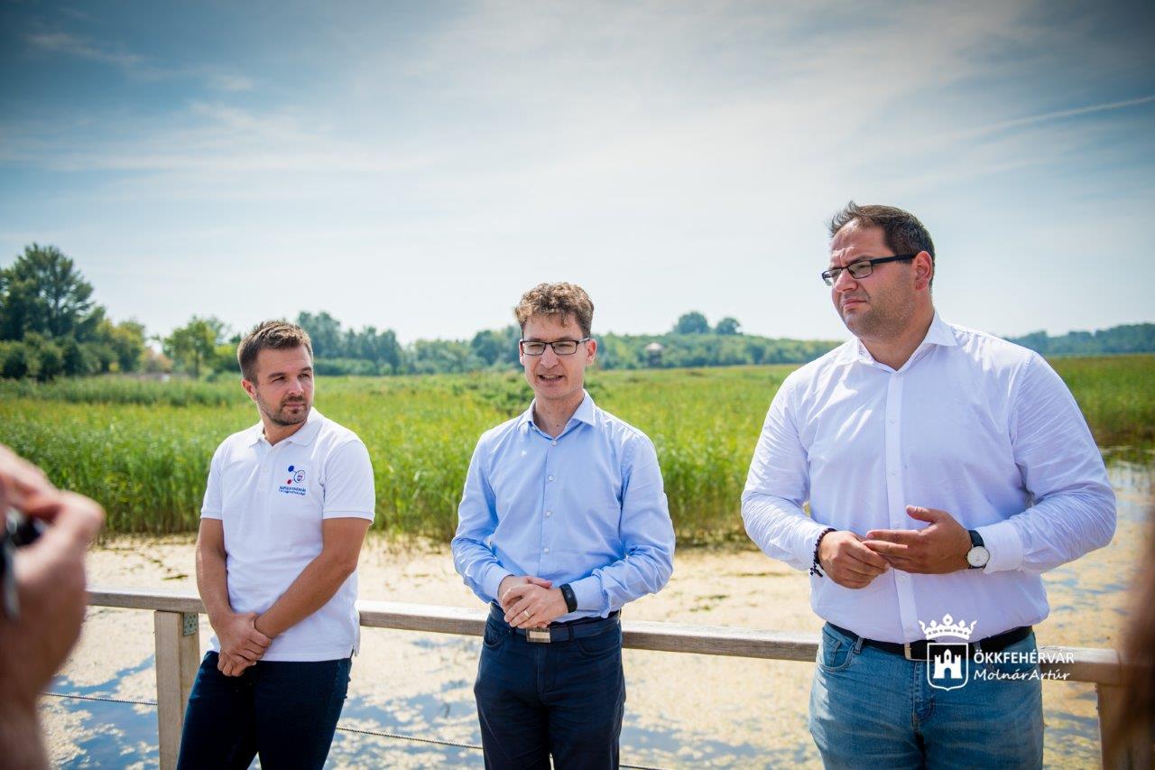 A Sóstó Természetvédelmi Terület megmentése érdekében végzett beruházásról és a még visszalévő munkálatokról a helyszínen tájékoztatott Cser-Palkovics András polgármester, Mészáros Attila alpolgármester és Csete Gábor a Városgondnokság természetvédelmi referense.