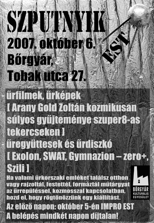 50 évvel ezelőtt, 1957. október 4-én a Bajkonuri űrrepülőtérről egy R-7 hordozórakéta segítségével Föld körüli pályára állították a történelem első műholdját, a Szputnyik-1-et. Az évforduló megünneplésére a Bőrgyár Kulturális Egyesület SZPUTNYIK-estet szervez 2007. október 6-án. Lesznek űrfilmek, űrképek, űregyüttesek és űrdiszkó. "Ha valami űrkorszaki emléket találsz otthon, vagy rajzoltál, festettél, formáztál műtárgyat az űrrepüléssel, kozmosszal kapcsolatban, hozd el bátran, hogy rögtönözzünk egy kiállítást." -invitál a programra a Bőrgyár Kulturális Egyesület.