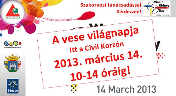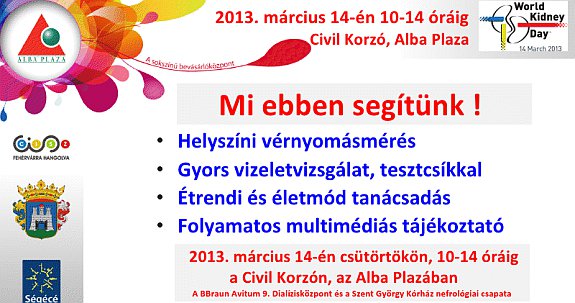 Március 14-én, csütörtökön 10 és 14 óra között az Alba Plazában található Civil Korzón vesebetegekkel foglalkozó szakemberek végeznek vérnyomásmérést, vizelet-szűrést, étrend- és életmód-tanácsadást, emellett folyamatosan vetítenek majd egy ötperces, tájékoztató kisfilmet. A bevásárlóközpont marketing igazgatója elmondta: megtiszteltetés számukra, hogy felkarolhatták a világméretű kezdeményezés helyi programjait. Almási Márta reméli, hogy minél többen eljönnek, és rádöbbennek az egészséges veseműködés, illetve a megelőzés fontosságára.