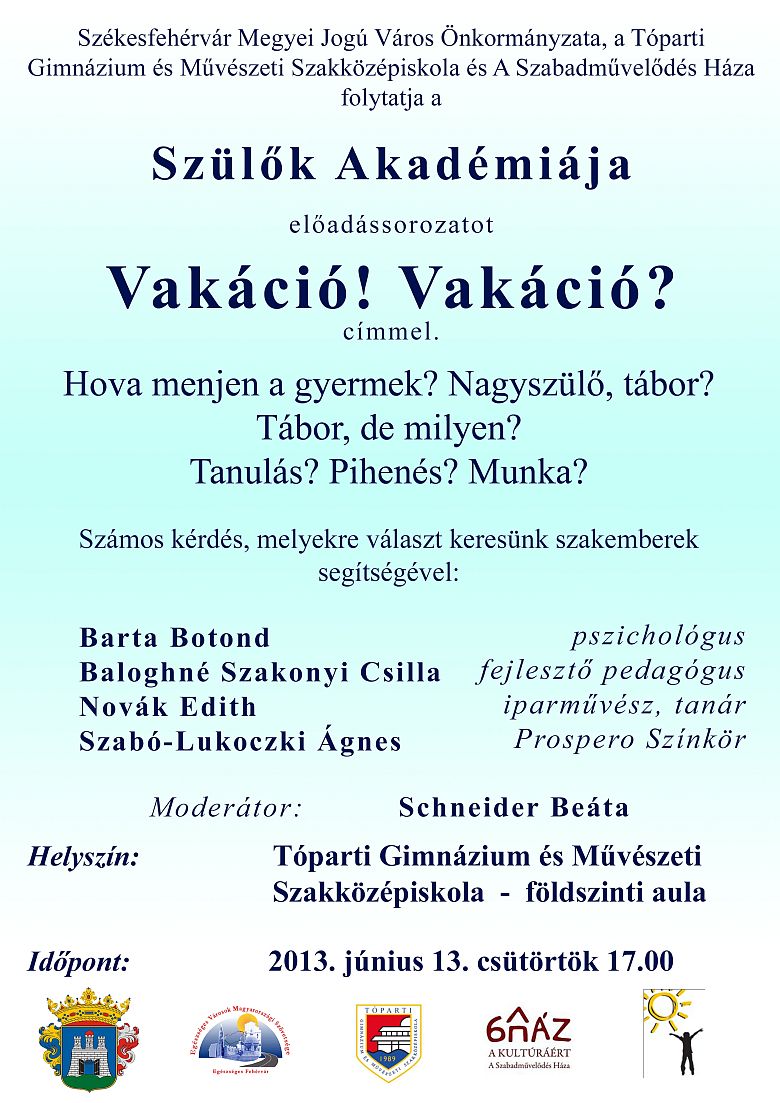 Csütörtökön délután öt órakor folytatódik a Szülők Akadémiája sorozat a Tóparti Gimnáziumban "Vakáció! Vakáció?" címmel. A vakáció hasznos eltöltéséről Barta Botond pszichológus, Baloghné Szakonyi Csilla fejlesztő pedaógus, Novák Edith iparművész tanár, Szabó-Lukóczki Ágnes a Prospero Színkör tagja beszélget Schneider Beáta moderátorral.
