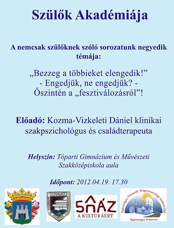 Április 19-én, csütörtökön 17.30 órakor kezdődik a program a Tóparti Gimnázium és Művészeti Szakközépiskola aulájában. Az oktatási intézmény Székesfehérvár Önkormányzatával és A Szabadművelődés Házával közösen indította útjára a sorozatot, ami egyre több érdeklődőt vonz és mindig aktuális, fiatalokkal és szülői magatartással kapcsolatos témákat vezet végig szakemberek közreműködésével.