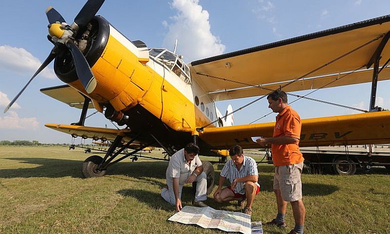 A tavaly nyár végi szúnyogirtás előtt a Városgondnokság szakemberei és a légi irtást végző pilóták egyeztetnek felszállás előtt.