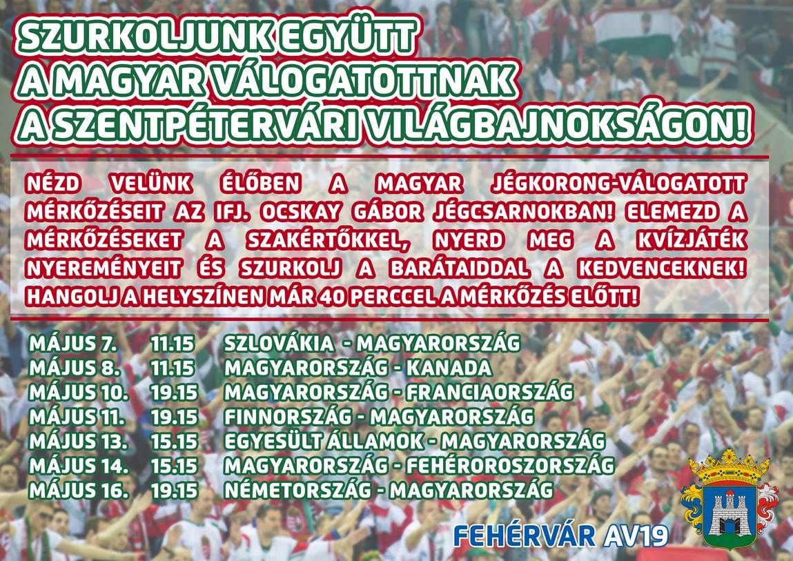 Az "A-csoportos" világbajnokság 2016. május 6-tól 22-ig tart majd Moszkvában és Szentpéterváron. A magyar válogatott a B-csoportban, Szenpéterváron játszik majd. Fehérváron az Ifj. Ocskay Gábor Jégcsarnokban közös meccsnézést szerveznek, ahol szakértőkkel, kvízjátékkal várják a szurkolókat a magyar válogatott mérkőzéseinek időpontjában!
