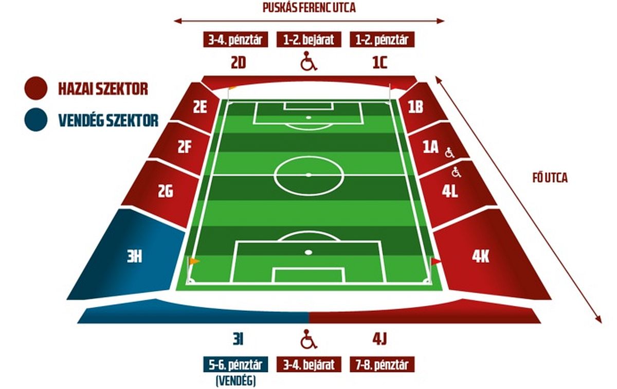 A Pancho Aréna adottságainak köszönhetően a szektorok közel vannak a pályához, így minden ülőhelyről kiváló rálátás nyílik a játéktérre. Szeretnénk felhívni a figyelmet, hogy a 2D és 2E szektorokat az ultra szurkolók részére jelölték ki, így azoknak, akik velük együtt szeretnének szurkolni, javasolják, hogy ide vásárolják meg bérletüket vagy belépőjüket. A családok számára azt javasolják, hogy a részükre kialakított 1B szektorba vegyenek jegyet.