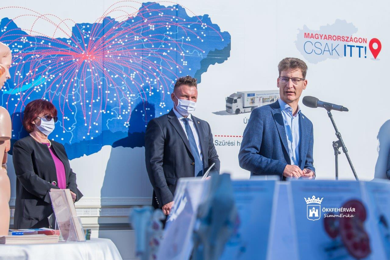Az Alba Plaza előtti téren Magyarország Átfogó Egészségvédelmi Programjának szűrőkamionja várta az érdeklődőket mintegy negyvenféle vizsgálattal.