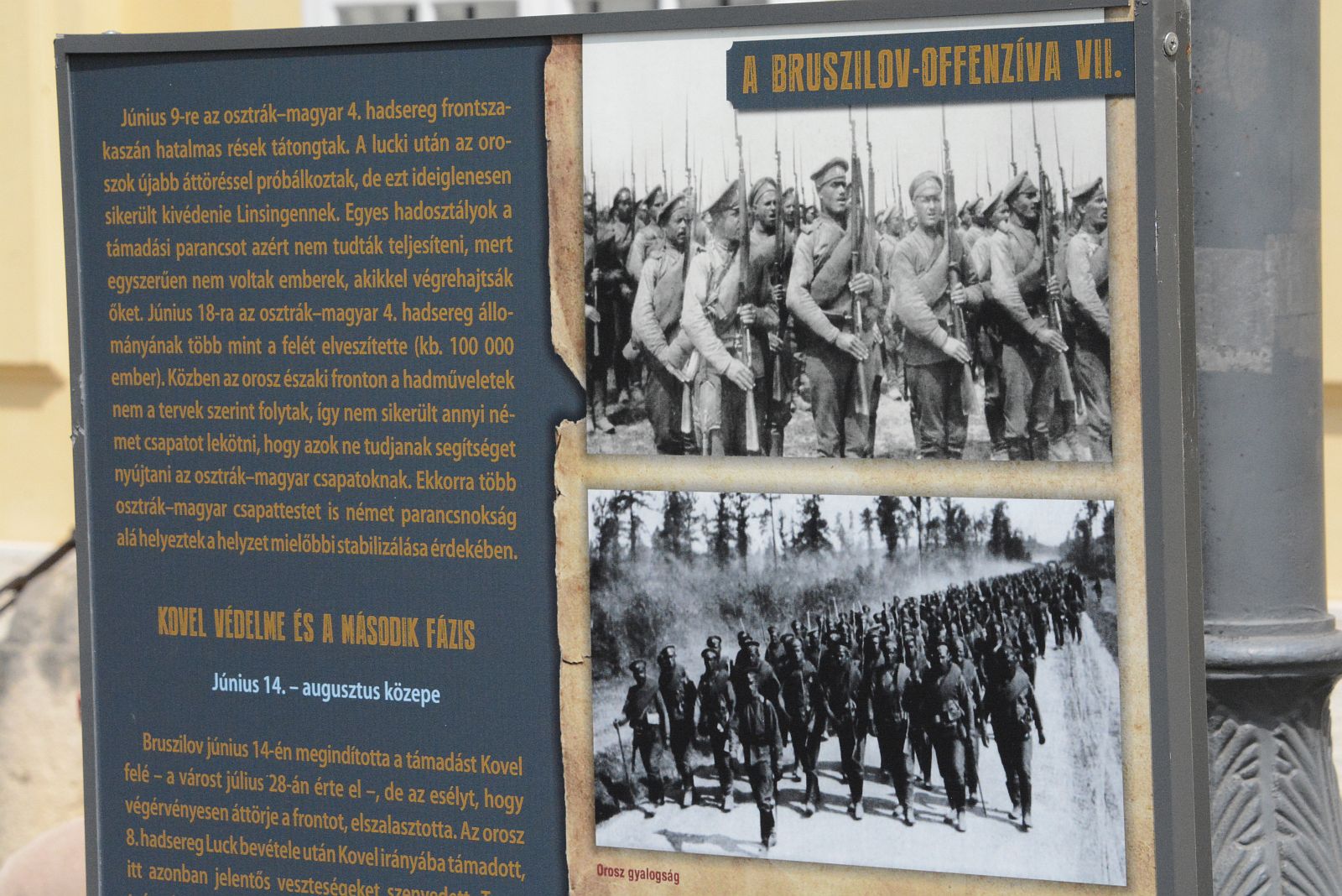 A „Kik acél falakként állották a vártát, orosz ingovány s Doberdó tetején” című szabadtéri tablókiállítás első fejezete tavaly május végétől augusztusig fogadta a látogatókat a Városház téren. A tárlat az első világháború azon főbb eseményeit mutatta be a kitöréstől 1915 nyárig, amelyek valamilyen módon köthetőek a székesfehérvári katonai alakulatokhoz.