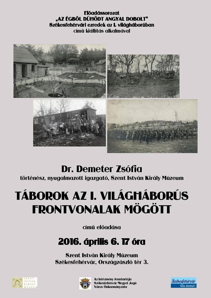 Táborok az I. világháborús frontvonalak mögött címmel tart előadást dr. Demeter Zsófia történész, a Szent István Király Múzeum nyugalmazott igazgatója szerdán 17 órakor a Múzeum Országzászló téri épületében. Az előadás „Az Égből dühödt angyal dobolt" - Székesfehérvári ezredek az I. világháborúban című kiállításhoz kapcsolódik, amely 2015 novemberében nyílt meg: az itt állomásozó katonai alakulatokat és azok épületeit mutatja be, végigkíséri a városban állomásozó ezredek I. világháborús tevékenységét, a front eseményeivel és a katonák front mögötti életével. A kiállítás képet ad a hátország erőfeszítéseiről is: hogyan segítették a rászoruló hadiárvákat, hadiözvegyeket és hadirokkantakat. A kiállított műtárgyak jelentős része magángyűjtőtől került a tárlatra, de számos fennmaradt emlék érkezett más intézményekből is.