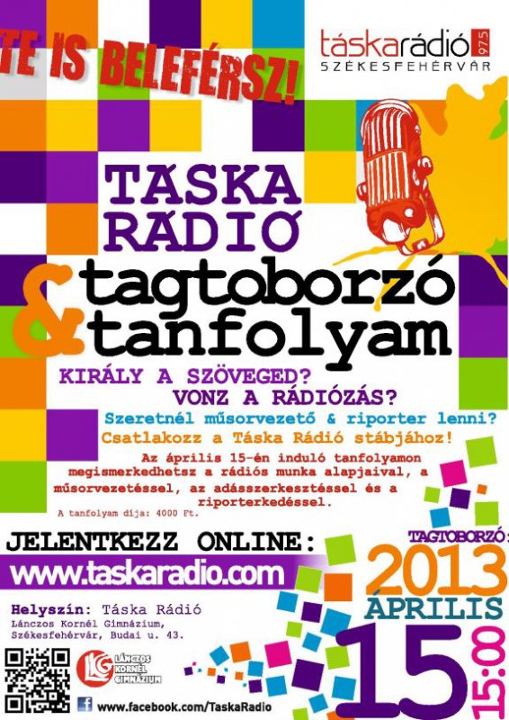 Riportereket és műsorvezetőket keres a Táska Rádió. A Lánczos Kornél Gimnáziumban működő szerkesztőségben április 15-én tagtoborzót szerveznek, amelyre olyan 12-20 éves diákok jelentkezését várják, akiket érdekel a szerkesztés, műsorvezetés, riporterkedés Az érdeklődők tavasszal egy tanfolyamon sajátíthatják el a rádiós munka különböző fortélyait. A tanfolyam díja 4000 Forint.