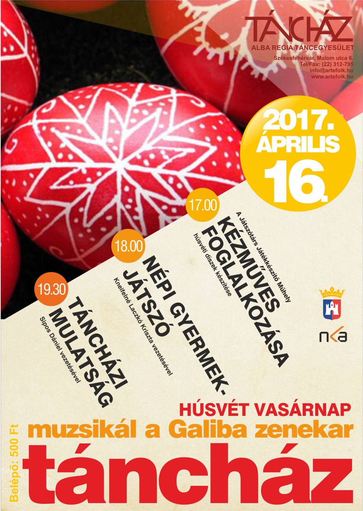Az Alba Regia Táncegyüttes április 16-i, húsvétvasárnapi családi programján ismét a Galiba zenekar húzza a talpalávalót. A rendezvény ünnepi hangulatban telik, 17.00 órától a Játszótárs Játékkészítő Műhely tart kézműves foglalkozást, melynek keretében húsvéti díszeket lehet készíteni. 18.00 órától Kneifelné Laczkó Krisztina vezeti a népi gyermekjátszót, majd 19.30 órától Sipos Dániel irányításával zajlik az ünnepi táncházi mulatság. A belépődíj 500 forint.