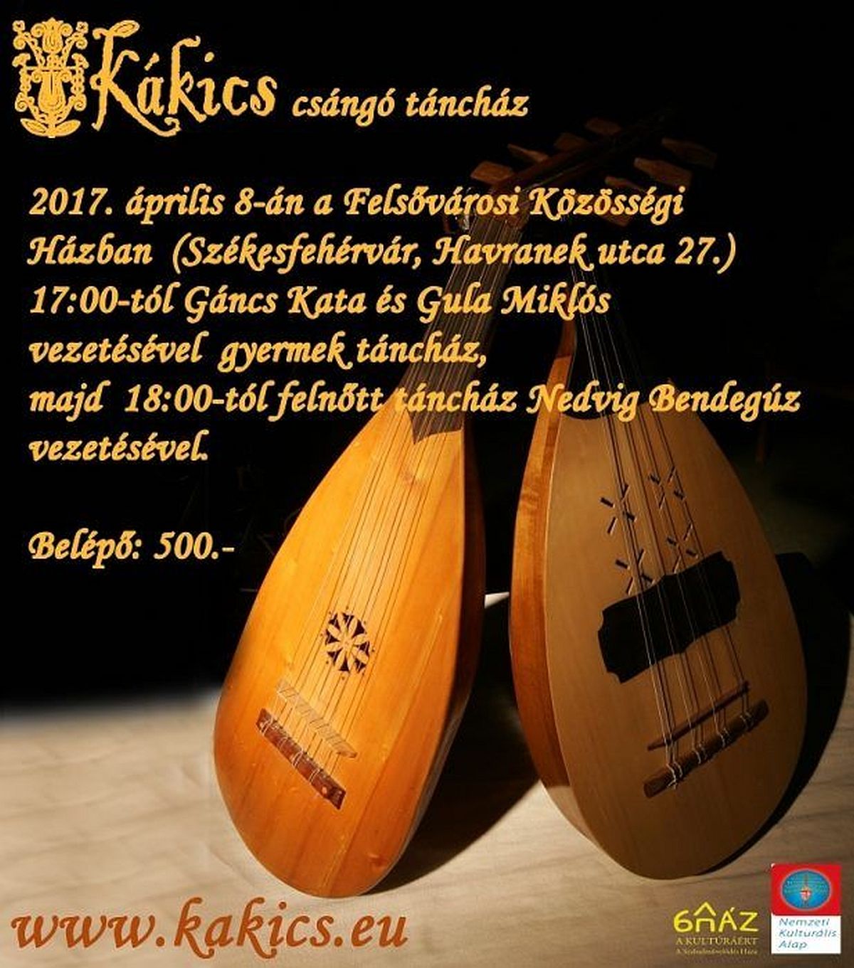 A Kákics együttes táncháza április 8-án, szombaton a szokott helyszínen, a Felsővárosi Közösségi Házban lesz, ahol – Szent György hava lévén – ezúttal szót kérnek a pásztorok is. A gyermekprogram 17.00 órakor kezdődik Gáncs Kata és Gula Miklós vezetésével, míg 18.00 órától a felnőtteké lesz a terep, ahol Nedvig Bendegúz diktálja a lépéseket. A büfé természetesen nem marad üresen, sörrel, borral, zsíros deszkával és palacsintával kínálják a megszomjazókat és a megéhezőket.