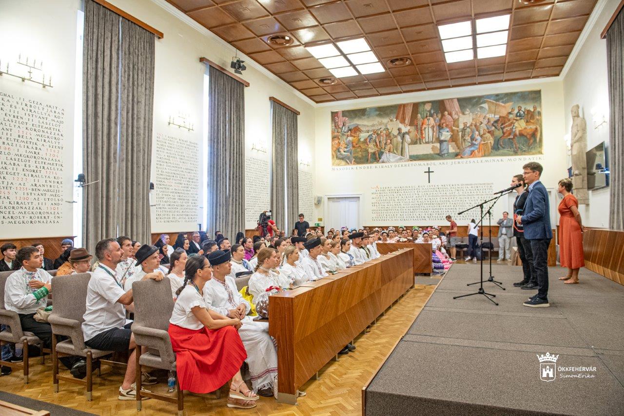 Szép hagyomány a Királyi Napokon, hogy a Székesfehérváron vendégeskedő néptánccsoportokat a Városházán is fogadják.