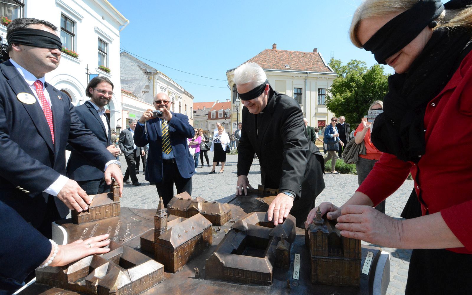 Az ünnepség végén Brájer Éva, Spányi Antal, István Zsolt és Fehér Jánosné bekötött szemmel tapintották végig az új alkotást.