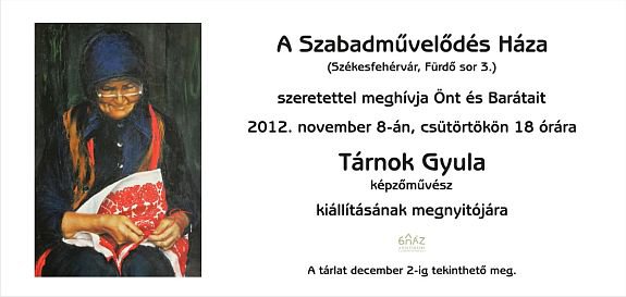 A Szabadművelődés Házában nyílik tárlat Tárnok Gyula festő, grafikus alkotásaiból november 8-án, csütörtökön 18 órakor. A megnyitón közreműködik a Kákics együttes is. A szervezők mindenkit szeretettel várnak a Fürdő sor 3-as szám alatti intézménybe. A tárlat december 2-ig lesz megtekinthető.