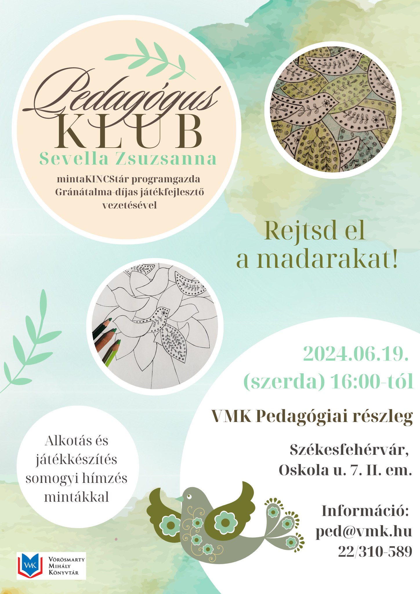 A 95. Ünnepi Könyvhét színes eseményei mellett számos eseménnyel várja a látogatókat a Vörösmarty Mihály Könyvtár a hónap harmadik hetében is. Június 19-én, szerdán 16 órától a Pedagógus klubban Sevella Zsuzsanna Gránátalma-díjas játékfejlesztő vezetésél alkotnak a résztvevők, akik somogyi hímzésminták felhasználásával készítenek játékokat az Oskola utcai épületben, a VMK Pedagógiai részlegén.