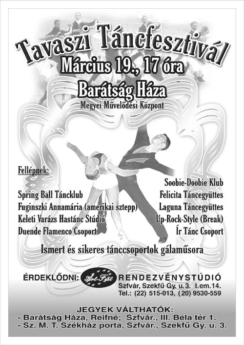 Az Art-Fest Rendezvénystudió és Produkciós Iroda szervezésében szombaton este Tavaszi Táncfesztivált lesz a Barátság Háza Színházteremében. Ismert és sikeres tánccsoportok forró hangulatú gálaműsora látható majd: swing, latintáncok, flamenco, breake, keleti táncok, akrobata, rakkendroll, amerikai sztepp, ír tánc, kán-kán. Fellépnek: Spring Ball táncklub, Soobie-doobie Klub, Laguna Táncegyüttes, Keleti Varázslat Hastánc Stúdió, Duende Flamenco Csoport, Up-Rock-Style /Break/, Hang-Szín-Tér Műv. Isk. World Dance Csoport, Fuginszki Annamária, Budapest Hip-Hop Táncsoport és a Budapesti Művészeti Főiskola tánckara.