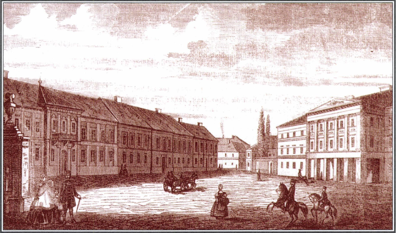 A Vármegyeháza (balra) és a szemközti térfal egy 1868-as ábrázoláson