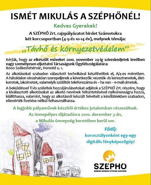 A Széphő Zrt. rajzpályázatot hirdet gyerekeknek két korcsoportban (4-9 és 10-14 év), melynek témája a „Távhő és környezetvédelem”. Az alkotások szabadon választott technikával A4-es méretben készülhetnek. A munkákat pedig november 24-ig levélben vagy személyesen lehet eljuttatni a Széphő Zrt. ügyfélszolgálatára. A legjobb pályaművek készítői értékes jutalomban részesülnek. Fődíj: korosztályonként egy-egy digitális fényképezőgép!