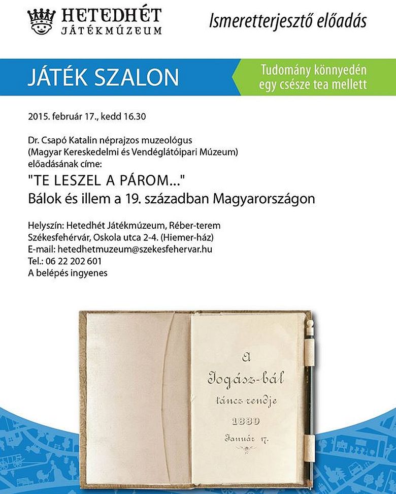 2015. február 17-én, kedden délután 16.30-kor folytatódik a Játék Szalon a Hetedhét Játékmúzeum Réber- termében. A Moskovszky- gyűjteményt bemutató ismeretterjesztő előadás- sorozat következő előadója dr. Csapó Katalin néprajzos muzeológus (Magyar Kereskedelmi és Vendéglátóipari Múzeum) lesz. Az előadás címe: „Te leszel a párom!” Bálok és illem a 19. századi Magyarországon.