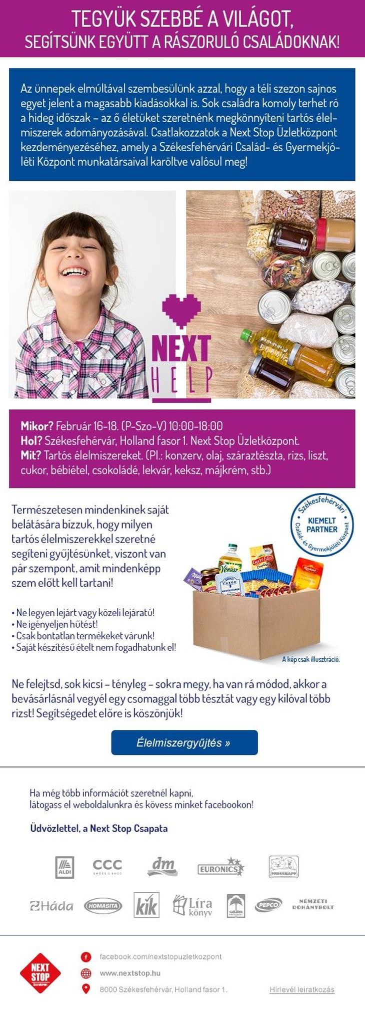 Tegyük szebbé a világot, segítsünk együtt a rászoruló családoknak! – a Next Stop Üzletközpont ezzel a felhívással tartós élelmiszereket gyűjt a szükségben szenvedőknek február 16-18. között, péntektől vasárnapig 10 és 18 óra között a Holland fasor 1. alatt.