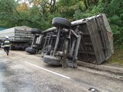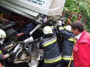 A Mercedes felborult billenőplatós pótkocsiját a tűzoltók daru csörlőjével állították kerekeire. Az Iveco teherautót pedig daruval emelték rá az autómentőre.