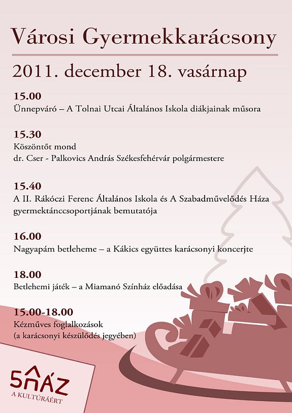 A Szabadművelődés Háza évről évre nagy sikerrel, rengeteg résztvevővel rendezi meg a Városi Gyermekkarácsonyt. December 18-án, vasárnap 15.00 órától ismét több száz gyermekre és szüleikre számítanak. A Tolnai Utcai Iskola tanulóinak műsora után a város polgármestere, dr. Cser-Palkovics András mond köszöntőt, majd a Rákóczi iskola és a művelődési ház gyermektánccsoportja mutatkozik be. A Kákics Együttes karácsonyi koncerttel, a Miamanó színház betlehemi előadással készül. A produkciókkal párhuzamosan folyamatosan kézműves foglalkozásokra várják a gyerekeket a karácsonyi készülődés jegyében. A Városi Gyermekkarácsonyra a belépés természetesen idén is ingyenes!