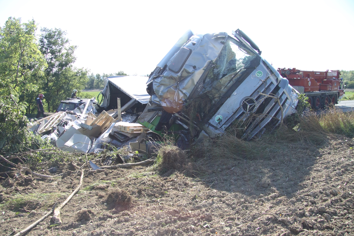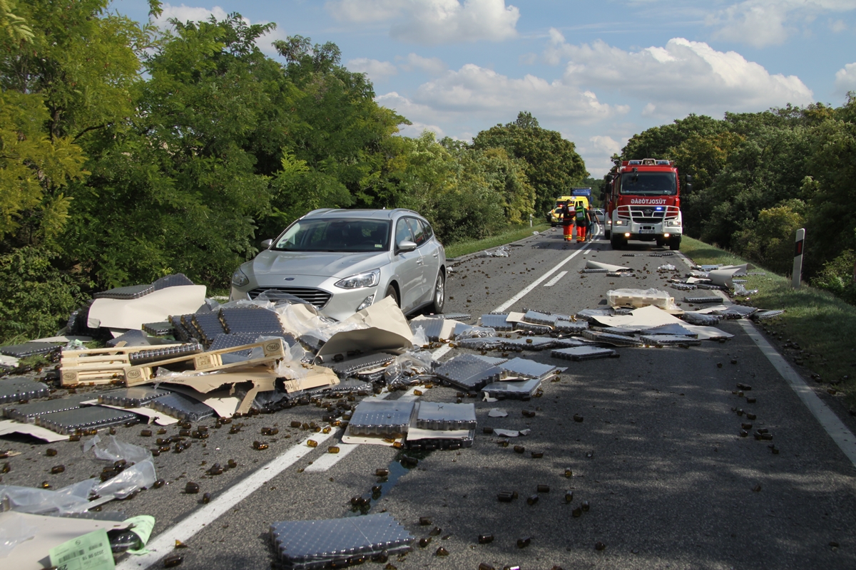 Felborult kamion zárta el a 81-es főutat szeptember 3-án délután Magyaralmásnál. Az orvosi fiolákat szállító nyerges vontató egy személygépkocsival ütközött, majd az úton keresztbe fordulva felborult.