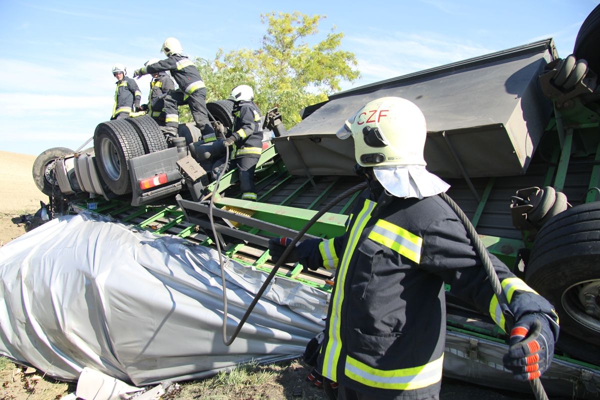 Az oldalára fordult ponyvás vontatmány részben ráborult egy másik személygépkocsira, a kiömlő rakományba pedig egy harmadik autó is belehajtott.