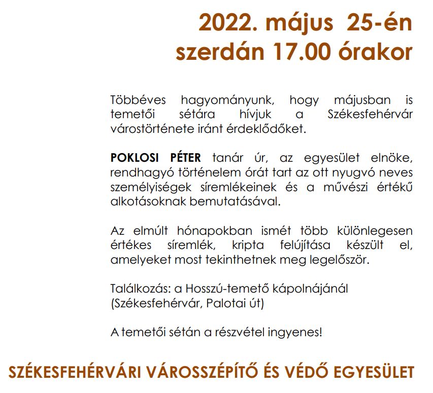 A Városszépítő- és Védő Egyesület május 25-én, szerdán 17:00-kor rendhagyó történelemórára várja az érdeklődőket a Hosszú-temetőben. Poklosi Péter tanár úr, az egyesület elnöke az ott nyugvó neves személyiségek síremlékeivel és a temető művészi értékű alkotásaival ismerteti meg a résztvevőket. Az érdeklődőknek a Palotai úti Hosszú-temető kápolnájánál lesz a találkozó a programra.