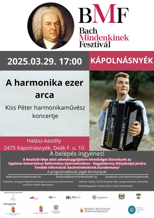 "A harmonika ezer arca" hangversenyen március 29-én, szombaton 17 órától a művész amellett, hogy ismert és kevésbé ismert zeneszerzők műveit játssza, a darabok között beszél a harmonikáról, annak működéséről, az adott zeneszerzőkről, érdekességekről. Vasárnap délelőtt, március 30-án 10 órakor Bach zenéje tölti be a kápolnásnyéki református templom falait. A zenés istentiszteleten közreműködik a Kápolnásnyéki Református Gyülekezet, az "Agárdi Éneklők Kamarakórus" összevont kamarakórusa (művészeti vezető : Mohai Judit), a Székesfehérvári Kodály Zoltán Általános Iskola, Gimnázium és AMI Kápolnásnyéki Művészeti Tagozatának zongora és furulya szakos tanulói, a Templom vonósnégyese, valamint Jobbágy Andor hegedű- és brácsaművész, valamint Tóka Szabolcs orgonaművész. A rendezvényhez kapcsolódva képzőművészeti kiállítás nyílik Novák Edith székesfehérvári képző- és iparművész és tanítványai szakrális-zenei tárgyú munkáiból.