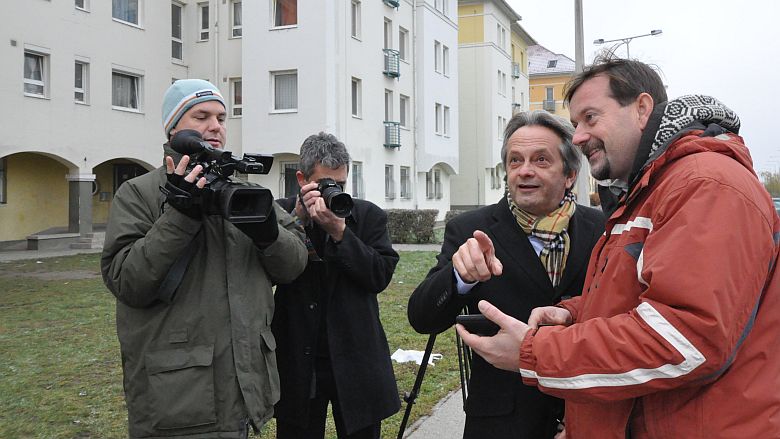 Vargha Tamás országgyűlési képviselő és Viza Attila a Palotaváros önkormányzati képviselője a Hübner András utcában ismertette a hat térfigyelő kamera pontos helyét.