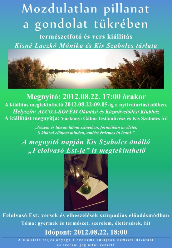 Továbbra is megtekinthető a „Mozdulatlan pillanat a gondolat tükrében” című természetfotó és vers kiállítás, Kisné Laczkó Mónika és Kis Szabolcs közös tárlata. Legújabb kiállításukra sok új dologgal készültek a művészek. A kiállítás augusztus 22-től szeptember 5-ig látogatható az ALCOA-KÖFÉM Oktatási és Közművelődési Klubház kamaratermében.