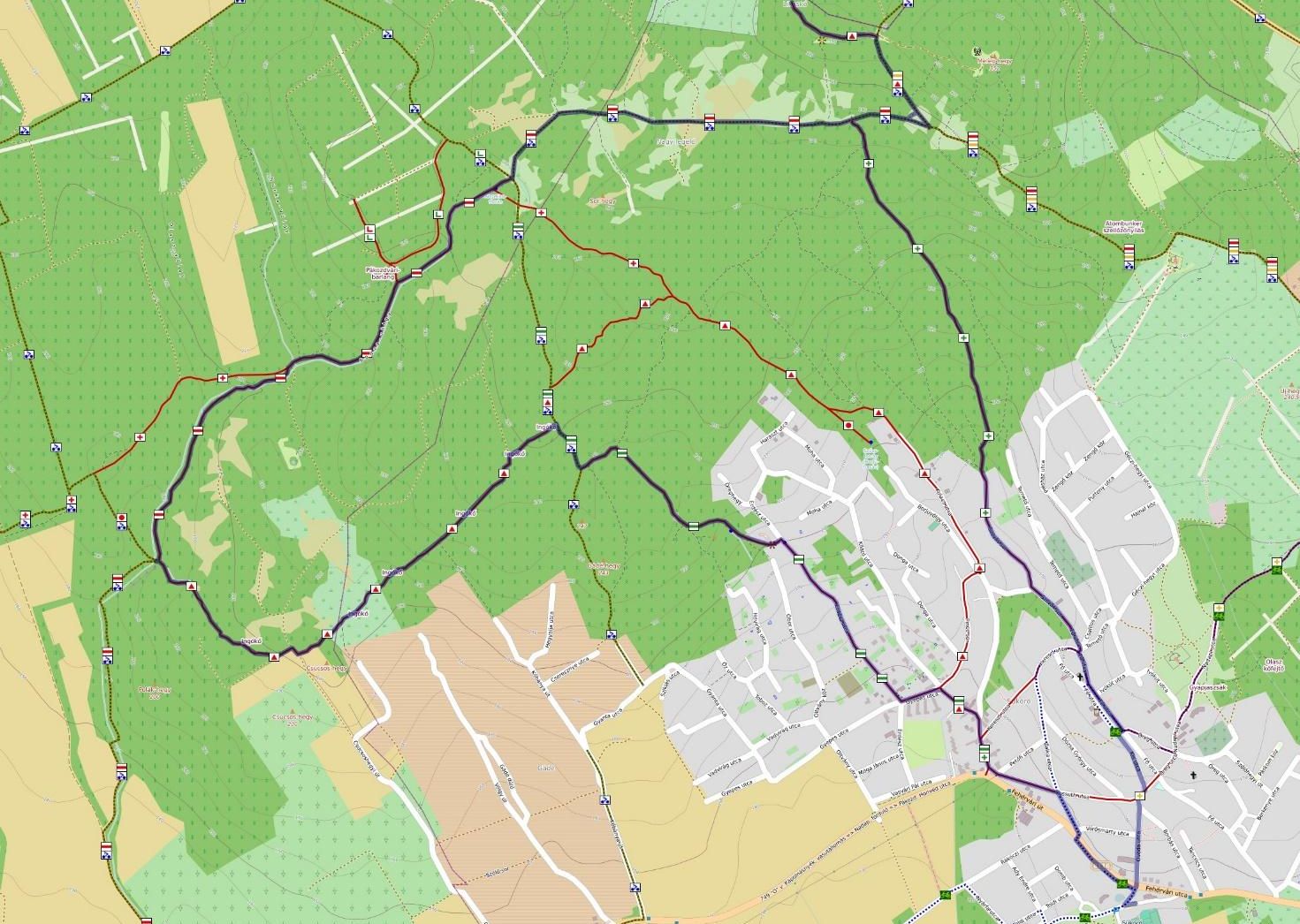 Miután kifújtuk magunkat P- jelzésen Kelet felé indulunk, majd a S- jelzésen Északnak fordulunk a Meleg-hegyre, a P▲-et követve pedig felkeressük a Likaskő sziklaalakzatot, ahol megismerkedünk a látványosság kialakulásával. Visszafelé a lövészárkoknál rövidítünk és egy jelzetlen ösvényen D felé indulunk amíg újra el nem érjük a P- jelzést, amin Nyugati irányba indulunk. A fennsíkon 1 km múlva elérjük az Angelika-forrást, ahol egy rövid pihenő után először Bodza-völgybe, majd a Hurka-völgyben folytatjuk utunkat, továbbra is a P- jelzésen. Eközben számos látványos sziklatömbben gyönyörködhetünk. Ezt követően a P▲ jelzést követjük, ahol az 1,6 km hosszú kell leküzdenünk a maradék 70 méternyi szintemelkedést. Cserében több ingókövet is megcsodálhatunk. A Z- jel DK-i irányba már visszavisz minket a faluba, az Erdész u., Gyepes u. és Pálinkaház u. érintésével elérünk a Fehérvári útra, amit követve visszaérünk a sportpályához.