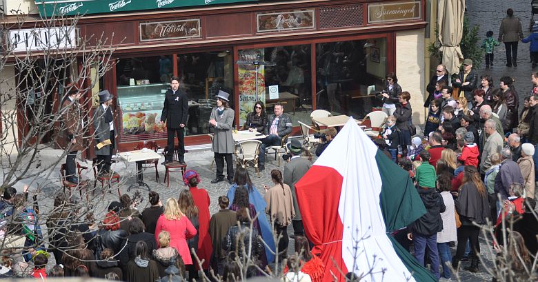 A Városház téren fehérvári diákok részvételével, Kozári Ferenc színész rendezésében a Március 15-i történéseket elevenítették fel. A képen éppen Petőfi Sándor szavalja a Nemzeti dalt a Pilvax kávéházban.
