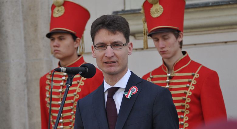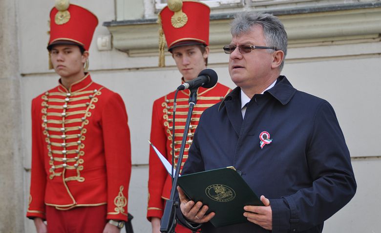 dr. Cser-Palkovics András, Székesfehérvár polgármestere ünnepi beszédében kiemelte, hogy 1848 márciusa nincs messze tőlünk, mindössze hét emberöltő választ el tőle. "Március 15-e nemcsak a bátor vezéreké, a Petőfi és Kossuth formátumú embereké, hanem azoké a millióké, akikben gyökeret vert az eszme és a szó." - mondta Székesfehérvár polgármestere, hozzátéve, hogy a nemzet 166 évvel ezelőtti egységénél is fontosabb az, hogy ma is egységesek legyünk a nemzet javának akarásában. Kiemelte, hogy a forradalom és szabadságharc nem a hősök akaratából történt, sokkal inkább "a lavinaként erőre kapó pillanatok találják meg a saját hőseiket." "Fejet hajtva ’48 márciusának nagyjai előtt, semmiképpen sem feledhetjük el azt, hogy a forradalom sikerének legfőbb letéteményesei mégiscsak a polgárok, a földművesek, vagy éppen a mesteremberek voltak. Õk adták javaikat a szabadság megvédéséhez, ők ragadtak fegyvert, ők áldozták az életüket és őket siratták kedveseik – többek között fehérvári otthonokban is.” – emlékezett dr. Cser-Palkovics András. Székesfehérvár polgármestere a fehérváriak bátorságára is utalt a nemzeti ünnepen, felidézve, hogy 1849 elején a császáriak kezére került a város. Erre volt válasz a Haleszi felkelés, amikor a Fehérvárra visszatérő császári hadsereget a Budai úton, a Halesz-ligetnél próbálta a fehérvári felkelők mintegy kétezres csapata kézitusában megállítani. dr. Cser-Palkovics András felidézte azt is, hogy 1848 nemcsak a forradalmat, hanem a történelmi múltjára való ráébredést is jelentette a város számára, 48 decemberében indultak meg ugyanis a Nagyboldogasszony Bazilika királysírjainak feltárásai, az ásatások során III. Béla és neje Antiochiai Anna hamvai és szarkofágjai kerültek napvilágra. Székesfehérvár polgármestere kiemelte, hogy ma is a város történelmi rangjának visszaszerzéséért küzd Fehérvár, ezt szolgálta a Szent István Emlékév és szolgálja az Árpád-ház program.