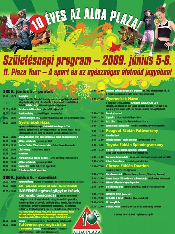 A sport és az egészséges életmód jegyében ünnepli tíz éves születésnapját a Székesfehérvári Alba Plaza bevásárlóközpont. A programokról és az áruház tíz éves fehérvári működéséről ma délelőtt tartottak sajtótájékoztatót. A Székesfehérvári Alba Plaza alapkövét 1998 augusztusában rakták le és 99 júniusában nyitotta meg kapuit az áruház.