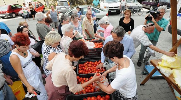 Befőzési paradicsomból egy kilót ötven forintért vásárolhattak meg csütörtökön délután a Vízivárosi lakók. A tökosztáshoz hasonlóan az akcióhoz szükséges paradicsomot Cece Önkormányzata ajánlotta fel, ezúttal a közmunkaprogram keretein belül termermelt paradicsomhoz juthattak hozzá kedvezményesen a székesfehérváriak. A paradicsomosztás a Fejér Termék, a közmunkaprogram, a vidék és a város összefogásának eredményeképpen valósulhatott meg.