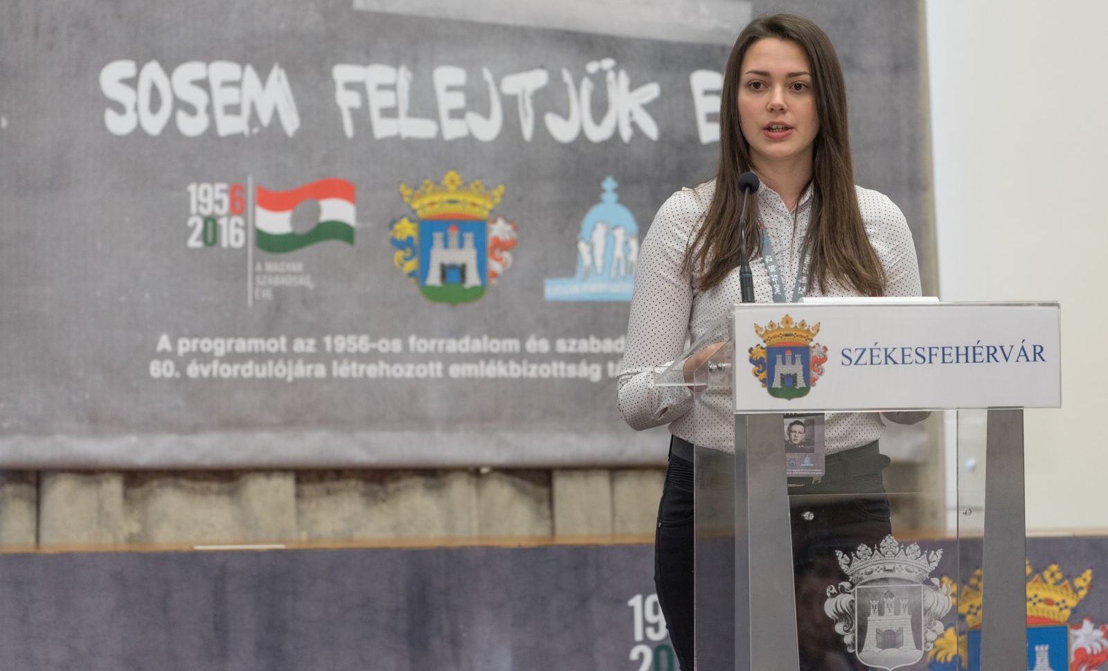 „1956. október 23-án egy aprócska, de elszánt nemzet hősei, a magyar szabadságharcosok, köztük sok ezer fiatal nemet mondott a diktatúrára, szabadsága és önrendelkezése megcsúfítására, és felemelte a fegyvert értünk, mai fiatalokért is. Hálával kell gondolnunk azokra a honfitársainkra, akik életüket, szabadságukat, egzisztenciájukat áldozták azért, hogy mi most szabadságban élhetünk, hogy a kommunista diktatúra már nem akarja elvenni a mai fiataloktól a boldogulás lehetőségét. 1956 üzenete egyértelmű és aktuális: szabadságunkért mindig harcolni kell, sosem adták ingyen és ezután sem fogják. Márpedig ez az egyik legnagyobb kincsünk, amelyeket ma is támadnak, külső erők próbálják megvenni. A forradalom és szabadságharc fiatal hősei példák ma is, hogy hazaszeretettel, bátorsággal, hittel és hűséggel érdemes Magyarországért dolgozni, ha kell harcolni is.” – mondta Nagy Boglárka, a Székesfehérvári Diáktanács elnöke.