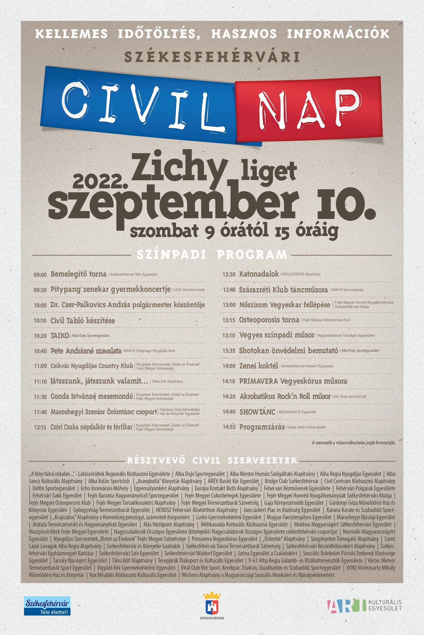 Szombaton rendezik meg a 15. Székesfehérvári Civil Napot a Zichy ligetben, ahol több mint 60 kitelepülő egyesület, alapítvány mutatkozik be. Az érdeklődőknek lehetőségük lesz megismerni a különféle területeket tevékenykedő szervezeteket, emellett hagyományosan színpadi produkciók is színesítik a 15 óráig tartó programsorozatot.