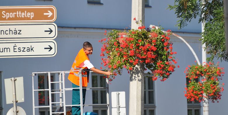 Elektromos kisautóval járják a várost a Városgondnokság kertészei és naponta meglocsolják és metszik a növényeket. A mai napon is mintegy 1200 liter vizet adnak a növényeknek, hogy szépek maradjanak egészen őszig.