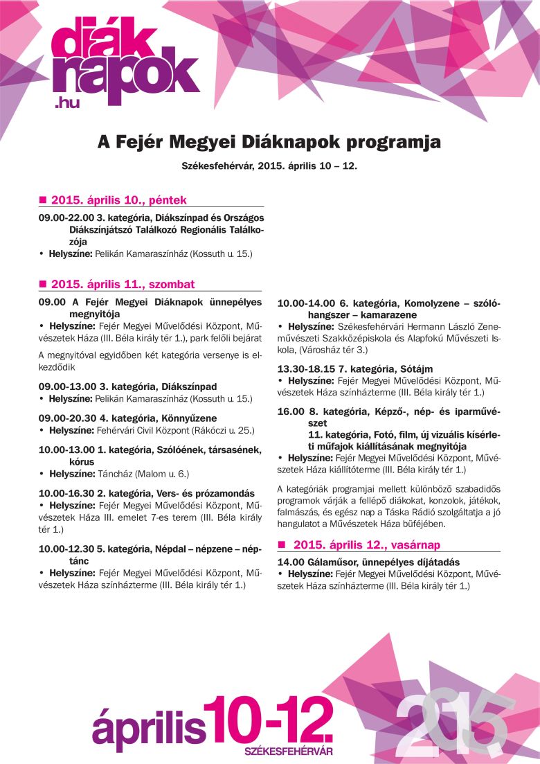 Juhász Zsófia, a Művészetek Háza igazgatója a programokat ismertetve elmondta, hogy az ünnepélyes megnyitó szombaton 9 órakor lesz a Fejér Megyei Művelődési Központban. A könnyűzenei kategóriában induló diákok a Fehérvári Civil Központban lépnek majd fel, ahol estig mennek a mini-koncertek, közel 100 produkcióval. A Sótájm kategóráról szólva elmondta, hogy az elmúlt években számtalan érdekesség, köztük hastánc, ír sztepptánc, bűvészprodukciók és kutyás produkciók mutatkoztak be és a kategória az idei évben is sok újdonsággal kecsegtet. A Sótájm kategóriához hasonlóan a vers és prózamondás helyszíne szintén a Művészetek Háza lesz. A szólóének, társasének, kórus kategóriának a Táncház ad helyet, amely már megszokott helyszínnek számít, hiszen a hely akusztikája kedvező a kórusok számára. Az ünnepélyes díjátadásra és gálaműsorra vasárnap 14 órakor kerül sor a Művészetek Háza színháztermében.