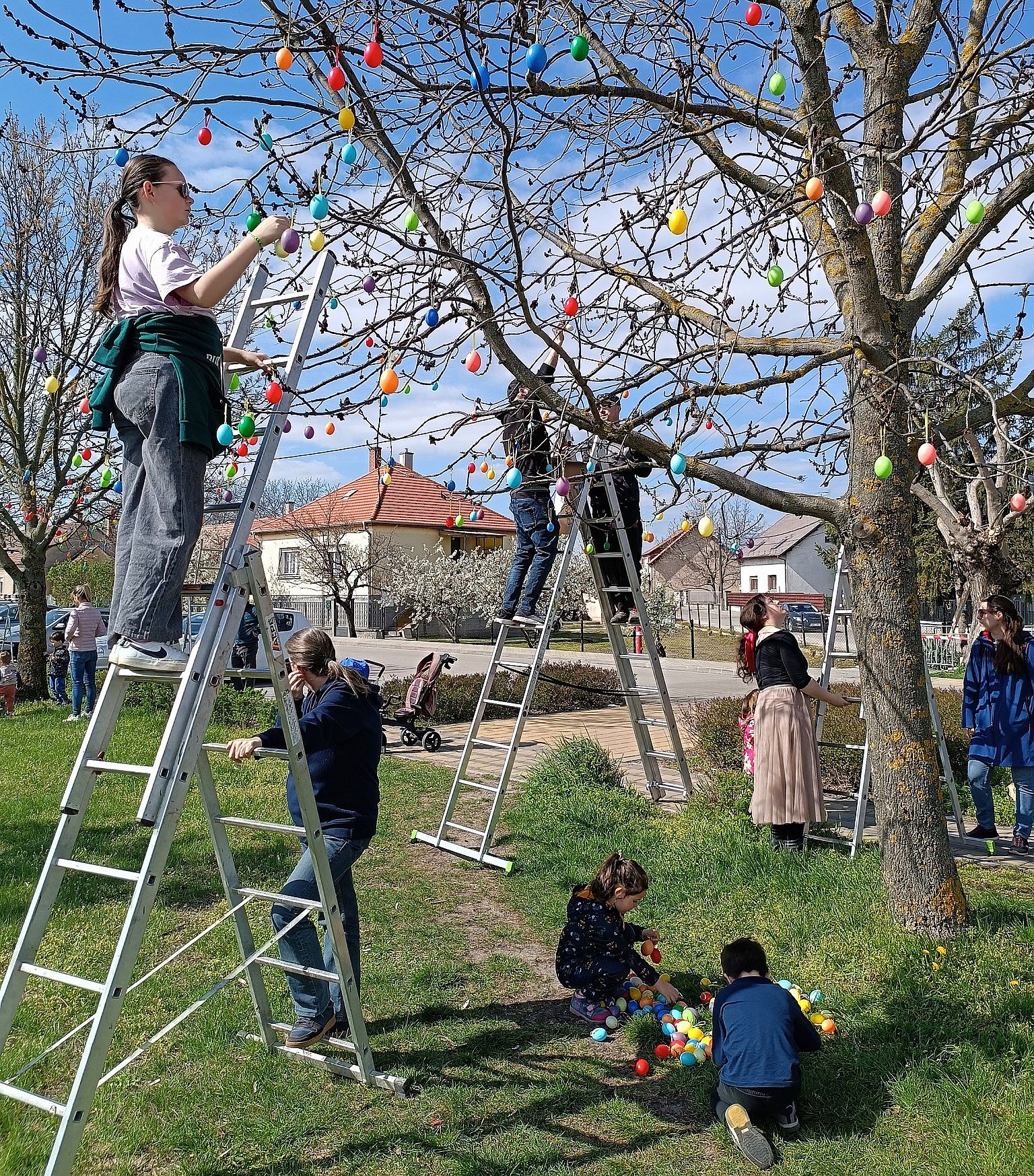 A tavaszi napsütésben családok, barátok, kicsik és nagyok közösen díszítették fel a fákat Maroshegyen.