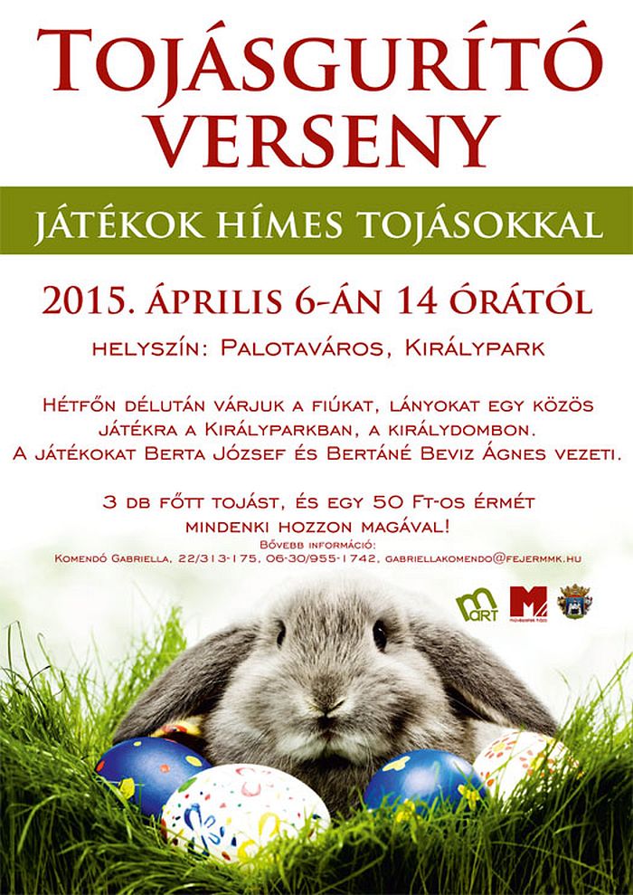 Április 6-án, hétfőn 14 órától várjuk a fiúkat és lányokat egy közös játékra a Királyok parkjába! Főtt tojásokat és egy 50 forintos pénzérmét mindenki hozzon magával.A játékot Berta József és Bertáné Bevizi Ágnes vezeti, a rendezvényről bővebb információt a 06-30/955-1742-es telefonszámon kérhet.