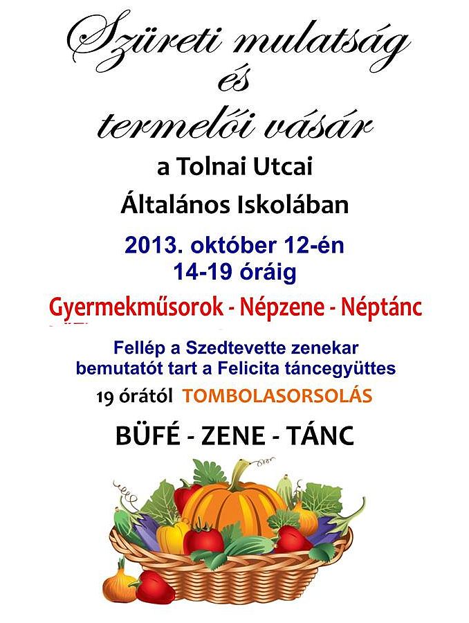Október 12-én, szombaton délután kettő és este hét óra között várnak minden érdeklődőt a tolnais szüreti mulatságra és termelői vásárra. Az iskola udvarán őstermelők árusítanak, míg az intézmény auláját a diákok veszik birtokba, akik saját készítésű portékáikkal várják a vevőket. A Tolnai Utcai Általános Iskola diákjainak műsora mellett fellép a Szedtevette zenekar és bemutatót tart a Felicita táncegyüttes is.