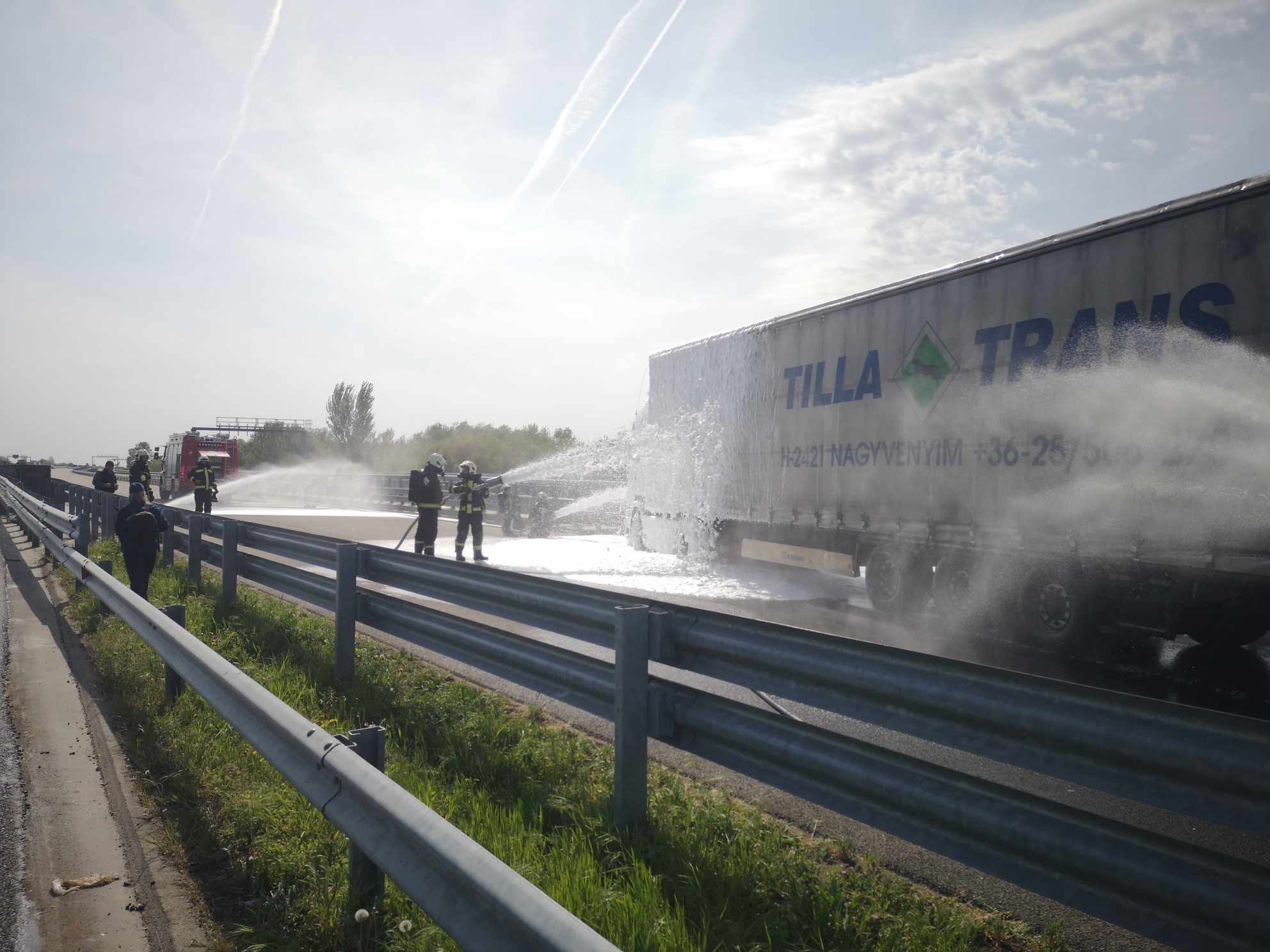 Az elképzelt szituáció szerint szalagkorlátnak ütközött és kigyulladt egy teherautó az M8-as autópályán.