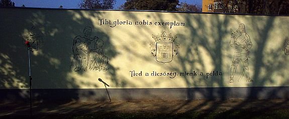 A történelmi emlékfalon két törökverő várkapitány, Varkocs György és Wathay Ferenc grafikus ábrázolása elevenedik meg. A két hős között látható Székesfehérvár Megyei Jogú Város címere, felül pedig egy latin felirat, "Tibi gloria nobis exemplum", melynek magyar fordítása "Tied a dicsőség, mienk a példa", amely a címer alatt látható.