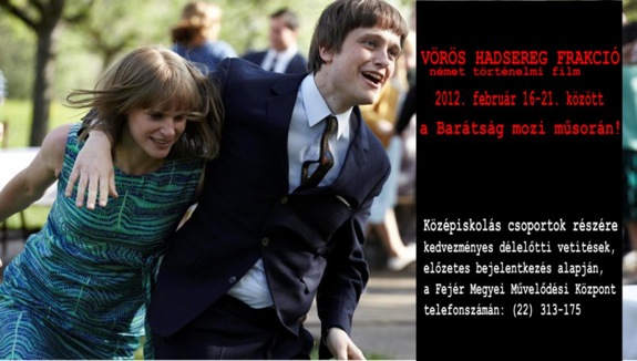 Újra történelmi filmeket láthatunk a Fejér Megyei Művelődési Központban. A Barátság Klubmoziban február 16-tól február 21-ig vetítik a Vörös Hadsereg Frakció című német filmet 18 órai kezdettel. A valódi dokumentumokon és megtörtént eseményeken alapuló film azokról a fiatalokról szól, akik az 1960-as években NSZK-ban először szembesülnek szüleik II. világháborús tetteivel. Délelőttönként fehérvári középiskolás csoportokat várnak a film vetítésére, kedvezményes áron.