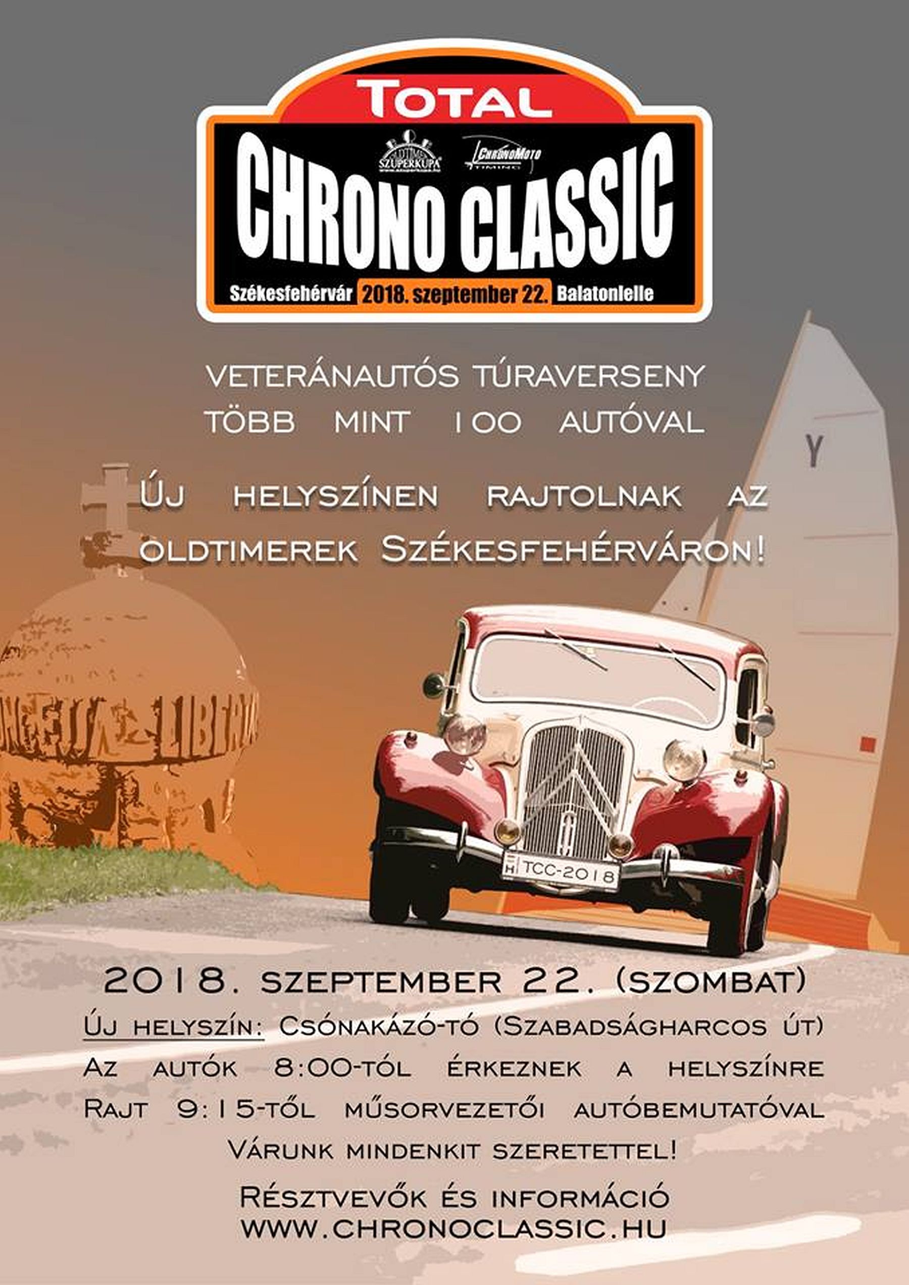 A verseny során több mint 100 csodálatos oldtimer és különleges youngtimer autó indul Székesfehérvárról, majd Kaposvár érintésével érkezik meg Balatonlellére. A Total Chrono Classic mezőnyében feltűnnek majd - a szocialista járművek remekei mellett - amerikai, olasz, angol, francia és német járműcsodák is.