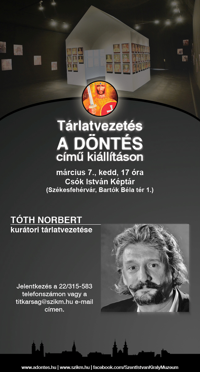 Március 7-én, kedden 17 órától Tóth Norbert a kiálllítás kurátora tart szakvezetést A Döntés című kiállításon a Csók István Képtárban. A tárlaton Somogyi Győző 127 festménye, valamint Párkányi Raab Péter 66 fotográfiája látható, a sötét térben berendezett kiállítás utazást szimbolizál a hősök dicsősége és a fenevad félhomályban felsejlő 66 képmása között.